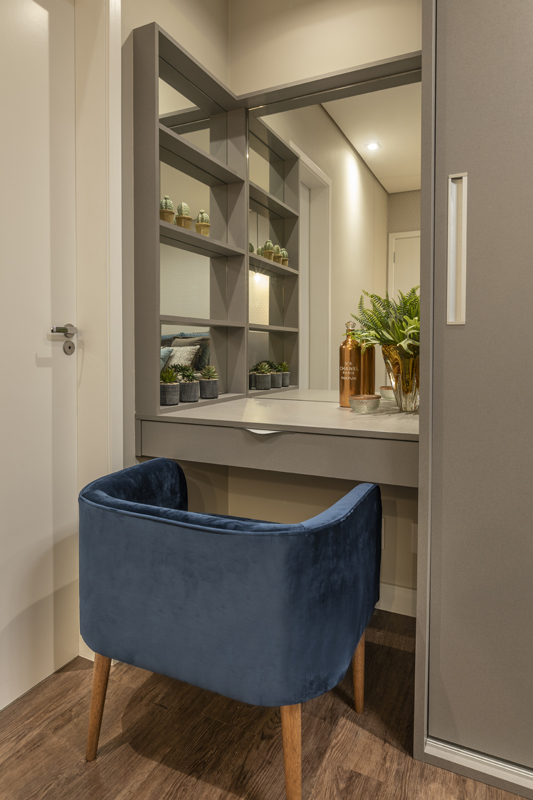 Ao lado do armário ainda foi possível criar um penteadeira para aqueles momentos especiais onde nos dedicamos para fazer o melhor por nós e nos sentir ainda mais bonita.