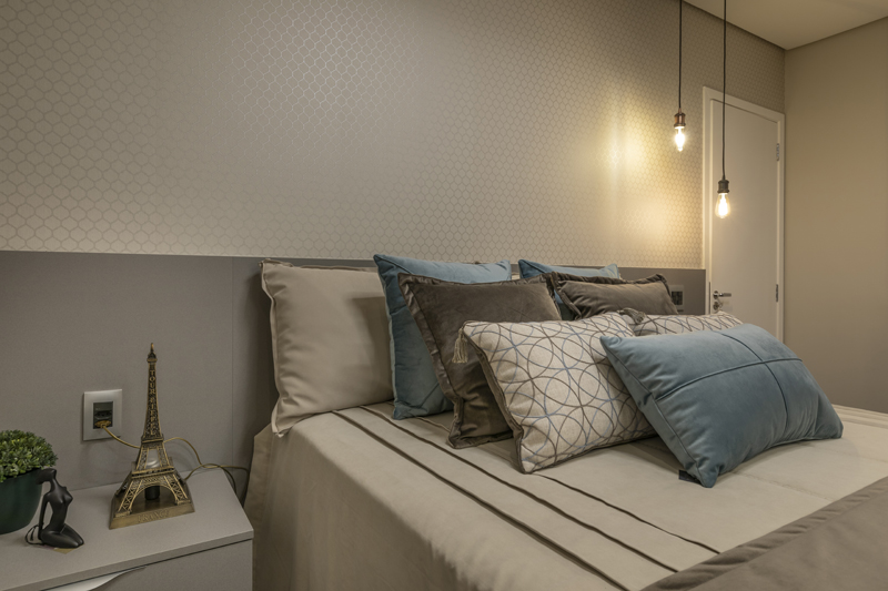 O espaço reduzido não impossibilita que a criatividade seja colocada em prática. Nesta suíte destacamos os tons amadeirados que trazem um aconchego através do piso vinilico juntamente com a cabeceira, o papel de parede e a persiana nos mesmos tons. A iluminação intimista através dos pendentes permitem um ambiente leve para aqueles momentos de descanso que todos buscam no dormitório e ao contrário de um abajour não ocupa espaço nas mesas de cabeceira que neste caso estão suspensos permitindo uma leveza na parte visual e para a praticidade de limpeza do piso.